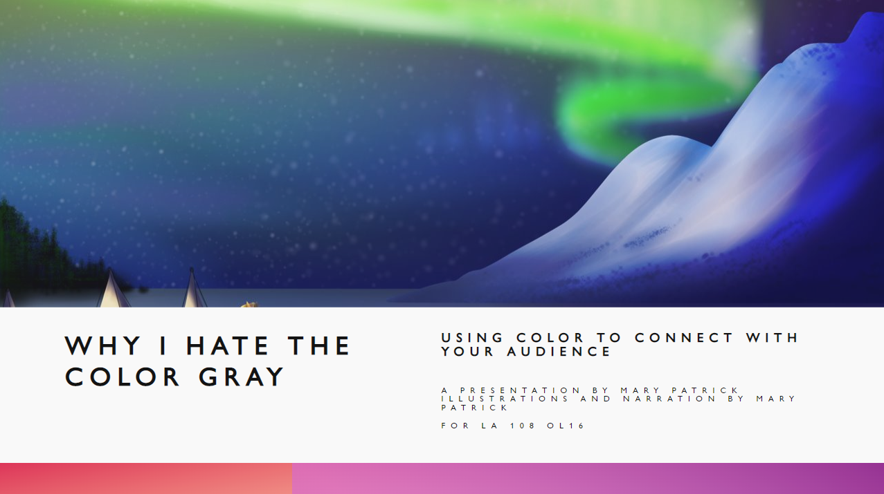 This presentation was made for my "Composition for the Artist" course taught by Professor Michael Routery at Academy of Art University. In this project, I analyze and explain the psychological benefits of using the Color Theory to better elicit emotion in an audience. The project features audio narration by myself and features a practical explanation on the process using my own art as examples.